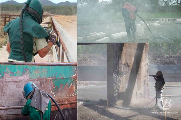 左上圖為戶外護(hù)欄利用壓送式噴砂機(jī)修復(fù),右上圖為石材表面噴砂處理,左下圖為大型船體外表利用壓送式噴砂機(jī)修復(fù)表面除銹,右下圖為橋墩的修補(bǔ)。